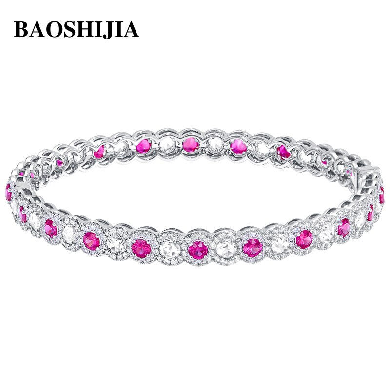 BAOSHIJIA Solid 18K White Gold Natural Diamond + Ruby Bangle Bracelet Re